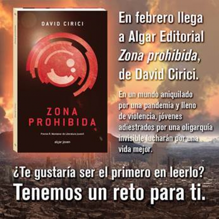 Zona prohibida, de David Cirici, llegará a las librerías el próximo 24 de febrero. En un mundo aniquilado por una pandemia y lleno de violencia, jóvenes adiestrados por una oligarquía invisible lucharán por una vida mejor. La novedad de este lanzamiento editorial es que más de 20 jóvenes han aceptado el reto de leer el libro en exclusiva antes del 20 de febrero. El reto no es tan solo leer la obra en un tiempo récord, sino también escribir el primer capítulo de una posible continuación. Un lote de 250 euros en libros de Algar Editorial está en juego.