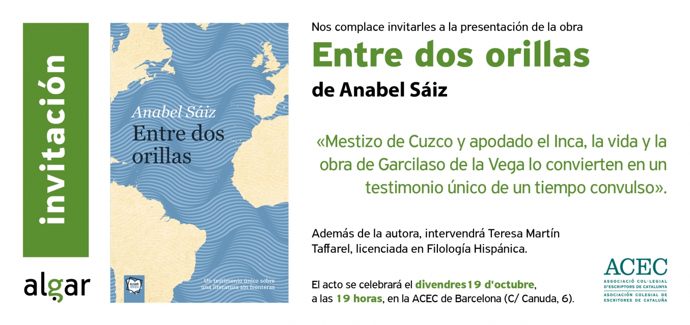 Si todavía no conocéis la novela Entre dos orillas, de Anable Sáiz, el próximo mes de junio tendréis la oportunidad de descubrirla de la mano de su autora en la Asociación Colegial de Escritores de Cataluña, situada en Barcelona. En la imagen encontraréis toda la información sobre el acto: