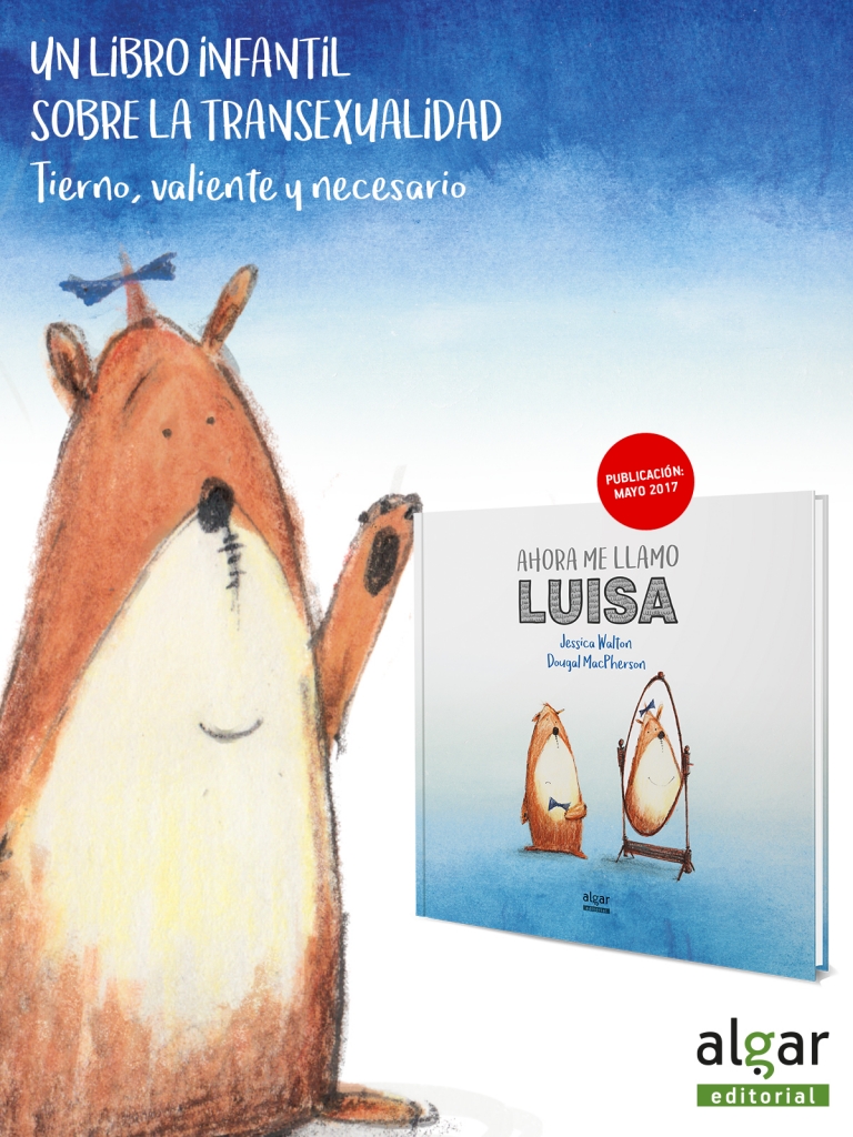 Algar Editorial publicará el próximo mes de mayo un álbum ilustrado sobre la diversidad sexual. Ahora me llamo Luisa, escrito por Jessica Walton e ilustrado por Dougal MacPherson, es una obra conmovedora sobre la identidad sexual y la amistad, que aborda la transexualidad con naturalidad y sencillez, y que ensalza la importancia de ser uno mismo. El relato acerca la diversidad de género al público infantil en un tono desenfadado y tierno que encantará a los pequeños y hará reflexionar a los adultos. Este título se publicará simultáneamente en Animallibres y en Tàndem Edicions con el título Ara em dic Joana.